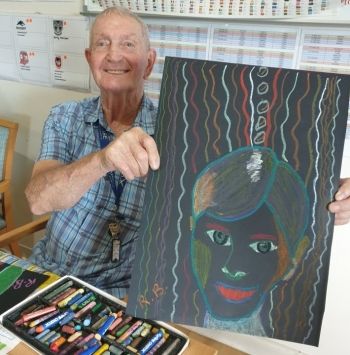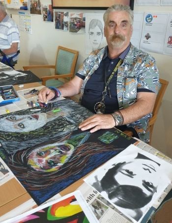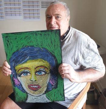 During Deanne’s classes with the Centre’s residents, she introduces them to different mediums so that they have an understanding and experience with them all. “We draw and paint,” she says. “We've dabbled with a bit of clay, which is great fun, and collage. We’ve used oil pastels, water colour and acrylic paint. I try and get them to do expressive artwork, as well. Sometimes there’s a bit of realism, and sometimes we do cartooning.”